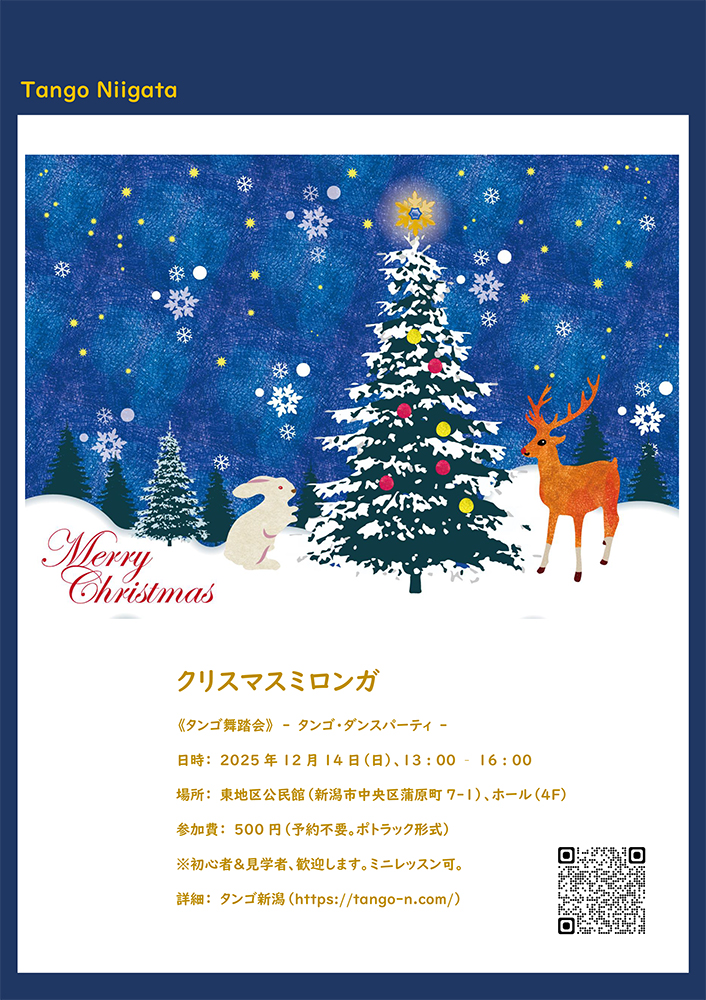 【日程表】 ・会場:東地区公民館(中央区蒲原町7-1、東地区総合庁舎) ・ホール(4F)または小ホール(2F) ・毎週金曜日、18:30-21:00 (毎週水曜日にも同じ時間帯&会場で開催しています。) 《 2026年1月 》 02日 お休み 09日 大ホール(4F) 16日 大ホール(4F) 23日 大ホール(4F) 30日 大ホール(4F) 《 2025年12月 》 05日 小ホール(2F) 12日 大ホール(4F) 19日 小ホール(2F) 26日 大ホール(4F) ↓タンゴ舞踏会(タンゴ・ダンスパーティ)のお知らせ! ![]() ※タンゴ新潟HPでも日程が掲載されています。